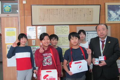 12月13日(月)から17日(金)まで、企画委員が行った「赤い羽根共同募金」へのご協力、ありがとうございました。12月23日(木)のお昼休みに、事務局である町社会福祉協議会から学校へ受け取りに来られました。校長室でお渡しをしました。総額は、おって連絡されるそうでうす。また、この募金の80%が南関町で役立てられるということでした。