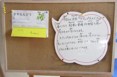 スナップエンドウは、春が旬の野菜です。1年のうち、今だけしか食べることのできない野菜だそうです。おいしくいただきました。