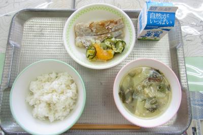 今日のメニューは、麦ごはん、みそ汁、太刀魚のからあげ、デコポンサラダです。