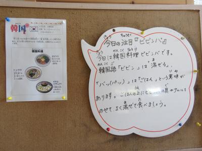 今日は韓国料理ビビンバでした。韓国語「ビビン」は「混ぜる」、「バッ(パッ)」は「ごはん」という意味があります。いろいろな具をごはんの上にのせ、よく混ぜて食べる料理です。今日は、子どもたちにビビンバを作ってもらいました。