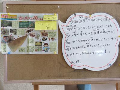 給食では、たけのこの水煮を使うので、一年中登場します。たけのこは食感があるので、食べるときのアクセントになります。また、おなかの掃除をしてくれる働きもあります。