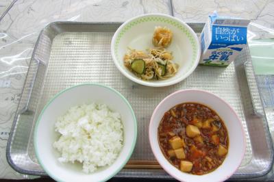 今日のメニューは、ごはん、マーボー豆腐、シューマイ、中華和えでした。