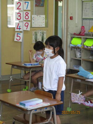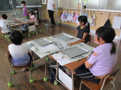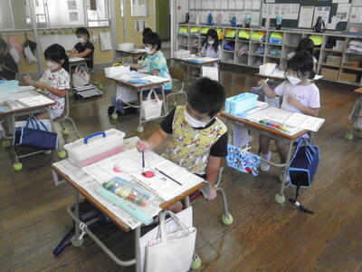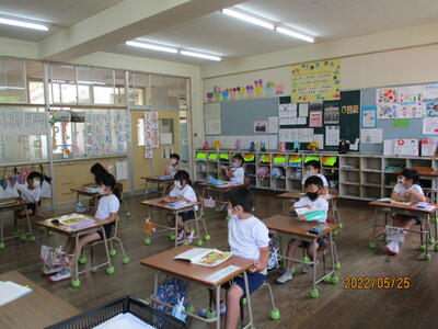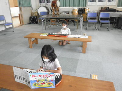 音楽では、新型コロナ感染対策で鍵盤ハーモニカを使用できないため、初めての鍵盤ハーモニカの授業は息を吹き込まないキーボードで行いました。『どんぐりさんのおうち』を練習しました。