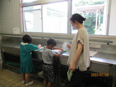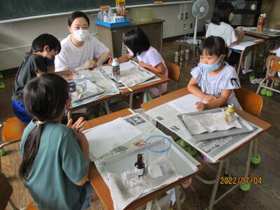 図画工作で、好きな色の絵の具を選んで、水の量を調整しながら自分だけのかき氷を描きました。