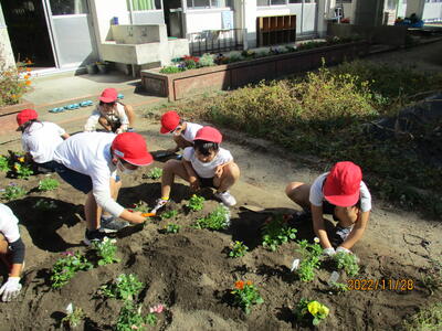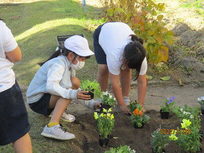 芋掘りが終わった学級園にたくさんの花を植えました。
