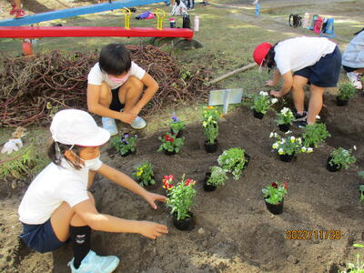 芋掘りが終わった学級園にたくさんの花を植えました。