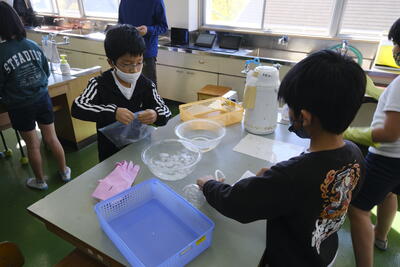 5つの班に分かれて、ドライヤーやお湯で温めたり、氷水や保冷剤で冷やしたりしながら、空気の体積がどのように変化するのかを調べました。