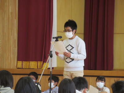 学習会閉講式 投稿日時 : 2022/03/16 承認者 先日、学習会の閉講式が行われました。 本来であれば、町民センターで行う予定でしたが、まん延防止措置が続いているため、学校の体育館で実施しました。 6年生からのメッセージを受け止め、新6年生を中心に、来年の学習会をさらに作り上げていきます。