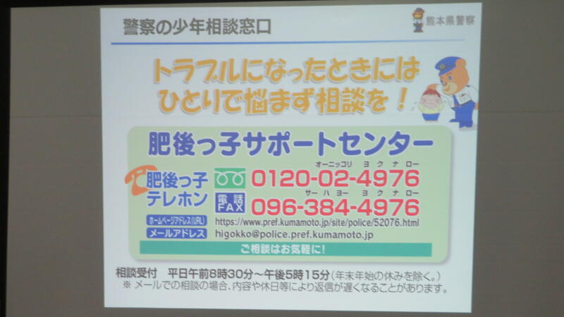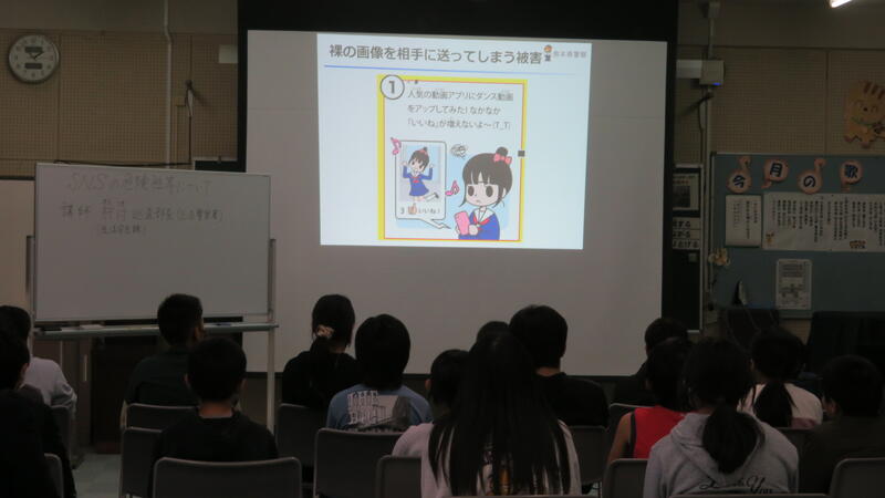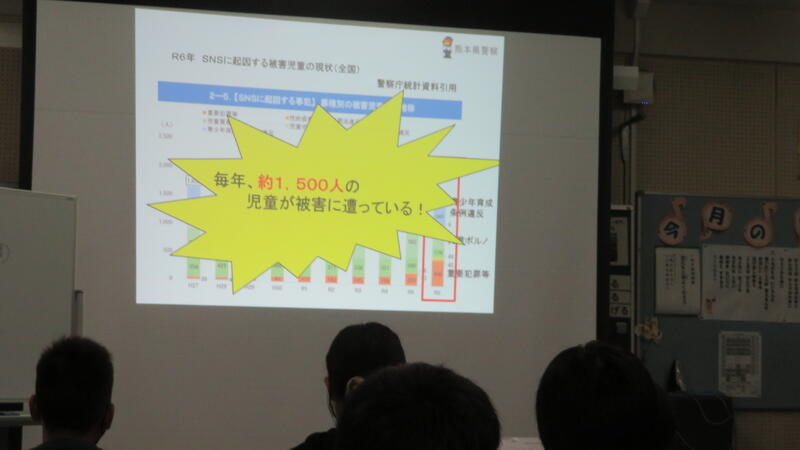 5・6年生は、玉名警察署から講師を来ていただき、SNSを使った犯罪に10代の子どもたちが巻き込まれていること、SNSを使うことで犯罪に巻き込まれる可能性があること、SNSを正しく使おうという内容で講話がありました。子どもたちもスマホやタブレット等でSNSをよく使っています。上手にコミュニケーションの手段として使って、より豊かな人間関係を築いてほしいと思います。