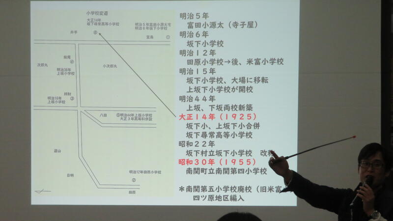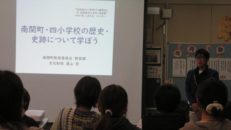 PTA講演会では、「南関町に歴史、四小の歴史について学ぼう」という演題で話していただきました。保護者であり、教育委員会の職員でもあられる遠山さんにご講話いただきました。卑弥呼の時代より前に南関に人が住んでいて稲作をしていたこと、大津山の南関城が大きなお城だったこと、四小は高道干拓を行った収益等を地域住民の方が教育のために使おうと決められて、学校教育に力をいれたれたことなどの話が印象的でした。
