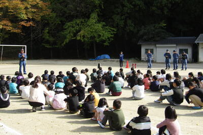 11月18日(月)、南関分署から5人の方に来ていただき、避難訓練をしました。今回は「地震が起こり、その影響で火災が理科室で発生した」という想定でした。