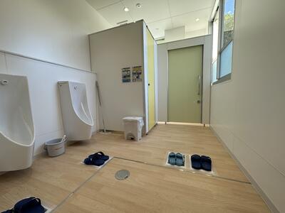 新しいトイレは、手洗いの水道や照明、換気扇などが自動で使えて衛生的です。また、男女が逆になり、女子用トイレが広くなりました。