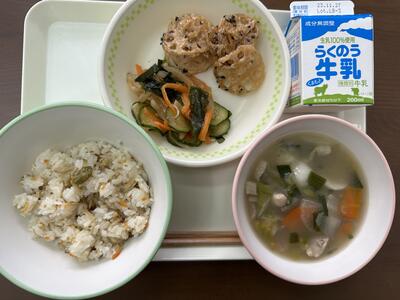 11月16日給食 ふるさとくまさんデー(宇城地区) 投稿日時 : 2023/11/16 承認者 今日のメニューは、びりんめし、白玉だんご汁、和風サラダ、れんこんチップ、牛乳でした。 今日はふるさとくまさんデー。今月は宇城地区の料理、食材でした。宇城地区由来の料理が並びましたが、れんこんは宇城市松橋町でよく採れるそうです。今日はごまと飴がかかったれんこんチップになっていて、これならおやつにもいいなあ、という料理でした。今日もおいしくいただきました。