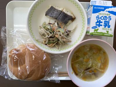 今日のメニューは、ひのくにパン、キャベツと肉団子のスープ、魚のハーブ焼き、ごぼうサラダ、牛乳でした。