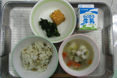 今日はふるさとくまさんデーです。 投稿日時 : 2022/03/18 承認者 今日のメニューは、高菜ごはん、牛乳、白玉だんご汁、田楽、ほうれん草のごまあえでした。 今日は、阿蘇地域の紹介です。高森田楽は、つるのこ芋をよりおいしくながく食べるために考え出された料理です。あまめの味噌をぬって焼きます。こんにゃくや厚揚げともよく合います。今日は、厚揚げの田楽でした。