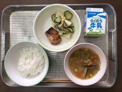 今日のメニューは、ごはん、鶏肉のマスタード焼き、りんごサラダ、ラビオリスープ、牛乳でした。