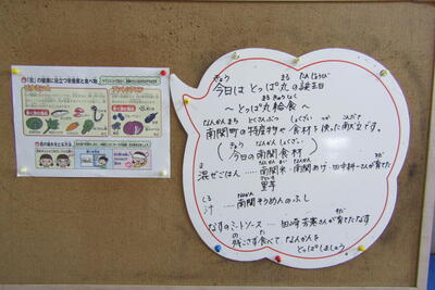 今日の注目は、とっぱ丸くんです。10月8日はとっぱ丸くんの誕生日ですので、とっぱ丸給食でした。南関町の特産物や食材を使った献立でした。今日の南関食材は、混ぜご飯には、南関米、南関あげ、田中耕一さんが育てた里芋、汁には南関そうめんのふし、なすのミートソースには、田崎芳憲さんが育てたなすが入っていました。残さず食べて、難関を突破しましょう!!