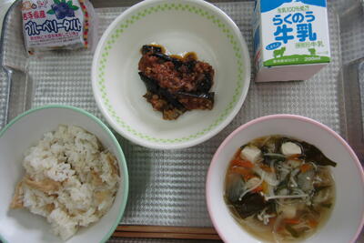 今日のメニューは、南関特産まぜごはん、牛乳、ふしそうめん汁、なすのミートソース、デザートでした。