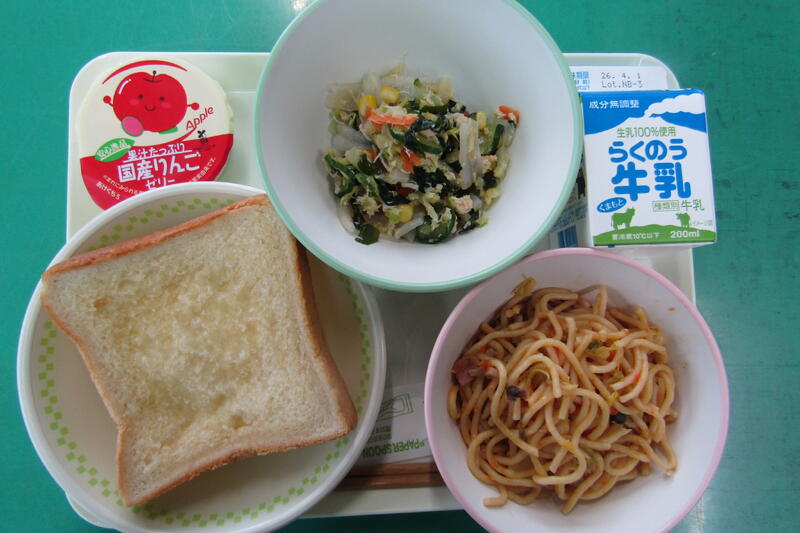 3月18日(木) 本日の給食は、はちみつレモントースト、春キャベツのスパゲッティー、こんにゃくサラダ、りんごゼリー、牛乳でした。