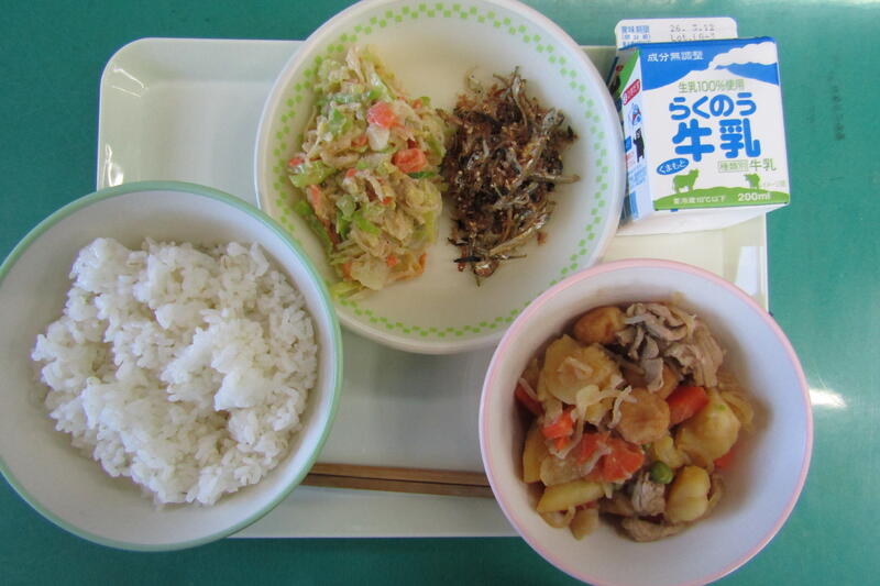 手作りふりかけには、いりこがたっぷり入っていました。そのほか、こんぶやかつおぶしなどもたくさん入っており、風味がよく、ご飯が進みました。子どもたちも楽しみにしていた一品でした。肉じゃがも、お野菜もお肉もたくさん入っており、食べ応えがありました。しっかり食べて午後からの勉強も頑張ることができました。今日もおいしくいただきました。ありがとうございました。ごちそうさまでした!
