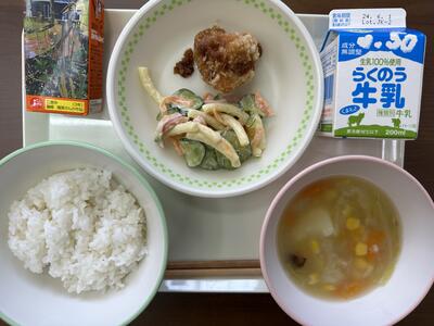 今日は運動会の予行練習でした。午前中2時間の練習でしたがヘトヘトに。その後の給食だったので、マカロニサラダの冷たさときゅうりの食感がうれしかったです。また、運動会前には3回、ジューシーがあります。職員は給食時に飲みましたが、子どもたちは他の時間に分けて飲みます。ビタミンCも今は特にうれしいです。今日もおいしくいただきました。