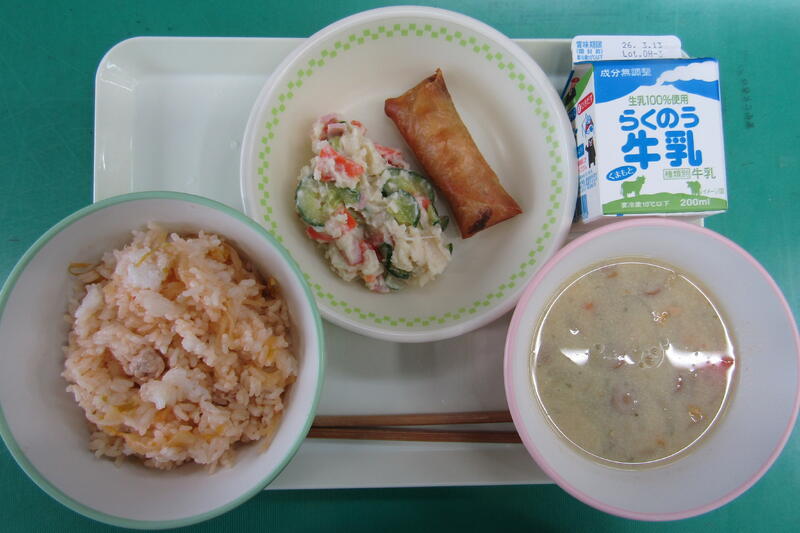 2月27日(金) 本日の給食は、キムタクご飯、コーンスープ、パリパリ春巻き、ポテトサラダ、牛乳でした。