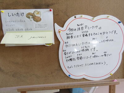 給食では、ほししいたけをよく使います。なぜかというと、ほししいたけの戻し汁にはうまみがたくさんあるので、料理がおいしくなるからです。今日のスープにはしいたけだけでなく、戻し汁も使っています。