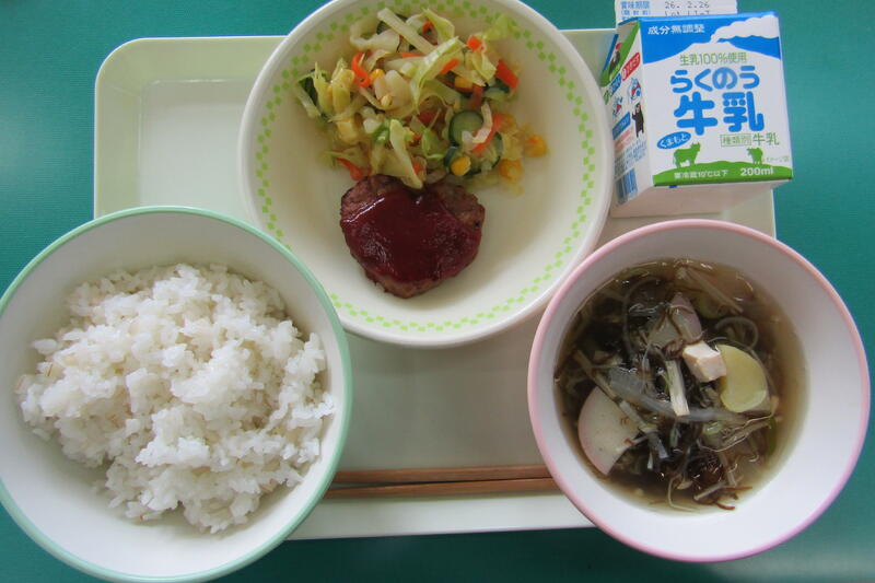2月12日(木) 本日の給食は、麦ご飯、もずくのすまし汁、ハートのハンバーグ、コーンサラダ、牛乳でした。