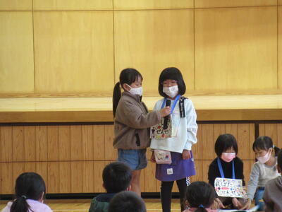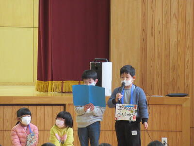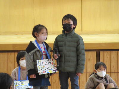 四小集会(1・2年生発表) 投稿日時 : 2021/12/02 承認者 四小集会で、1・2年生が大変すばらしい発表をしてくれました。 1年生は、四小の先生方にインタビューして分かったこと、やってみた感想などを元気よく発表してくれました。 2年生は、詩の発表、手話、歌など内容盛りだくさんの発表を行ってくれました。