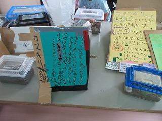 ふれあい広場(2年生) 投稿日時 : 2020/07/21 学校サイト管理者 生活科の学習で、2年生がいろいろな生き物を育てています。 虫かごの中に入れた生き物たちのお世話をし、紹介する「ふれあい広場」を作りました。 生き物の特徴やすみか等、わかりやすく説明しています。となりの学年の子どもたちも、楽しそうに生き物たちをながめていました。