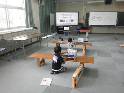 音楽では、新型コロナ感染対策で鍵盤ハーモニカを使用できないため、初めての鍵盤ハーモニカの授業は息を吹き込まないキーボードで行いました。『どんぐりさんのおうち』を練習しました。