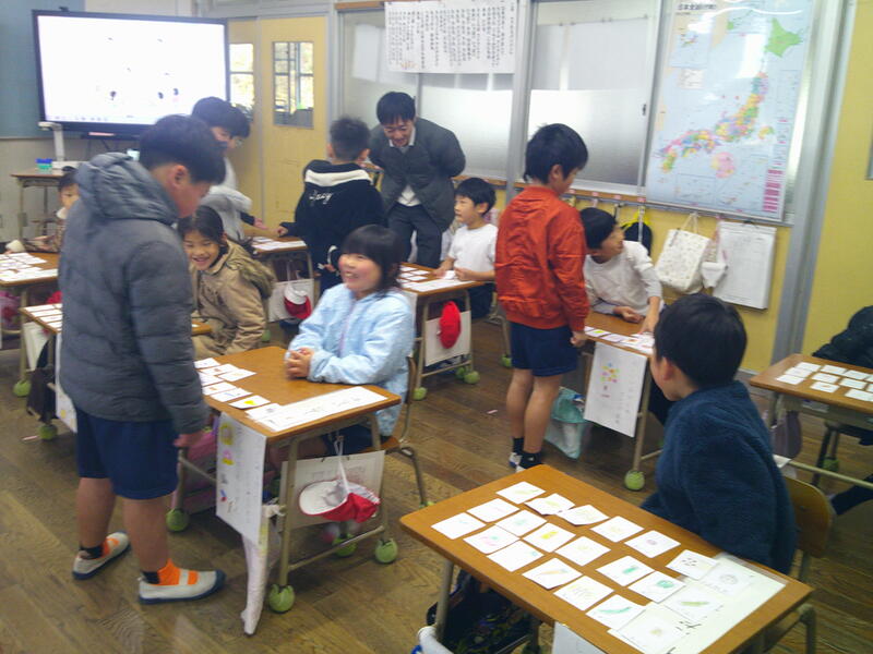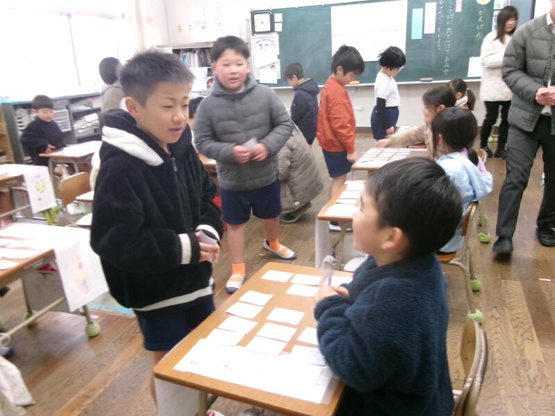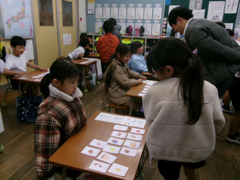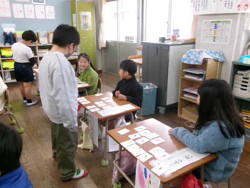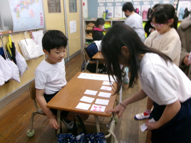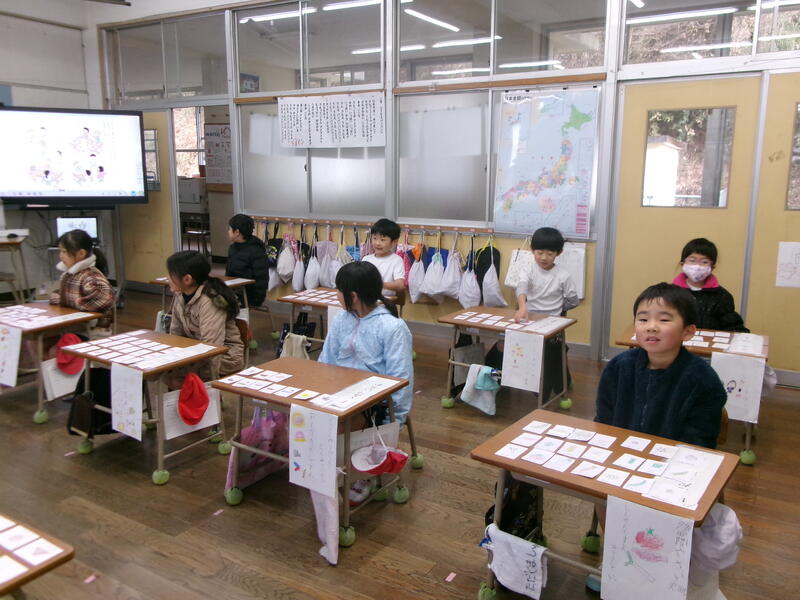 2月10日(火)に1年生がおみせやさんをしました。1年生は、国語の学習で「もののなまえ」を学習しています。「いちご」「りんご」「みかん」「ばなな」は、それぞれのものの名前で、それらをまとめた名前が「くだもの」であることをを学びました。その学習のまとめとして、「くだもの屋さん」「魚屋さん」「パン屋さん」「アイスクリーム屋さん」など子どもたちが好きなお店を開いて、「もののなまえ」についての考えを深めていきます。子どもたちは商品のカードを用意して、おみせやさんの準備をしました。2年生がお客さんとして来てくれて、楽しんで買い物をしてくれました。1年生の子どもたちは、たくさんの商品(物の名前を書いたカード)を作って、2年生に買ってもらい楽しい良い学習になりました。