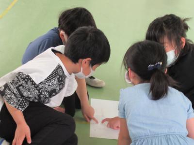 校舎の白地図に、自分たちで教室の名前などを記入していき、完成させました。