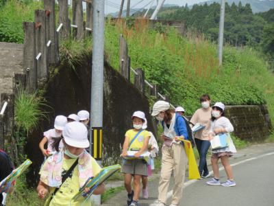 学校の外を実際に歩き、自分たちの目で確かめながら地図を作っています。