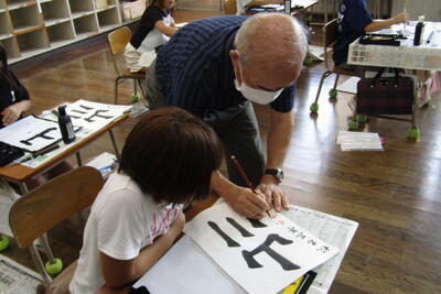 最初は恐る恐るだった子どもたちが、大里先生に教えていただいて、堂々と書けるようになりました。半紙に食い込むような筆遣いが立派にできました。