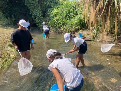 まず、内田川に行って川の水をくみ、水生生物を捕獲してバケツで持ち帰りました。学校では、水生生物を種類ごとに分け、水質に関する指標生物を探しました。子どもたちは、みんな熱心に取り組みました。