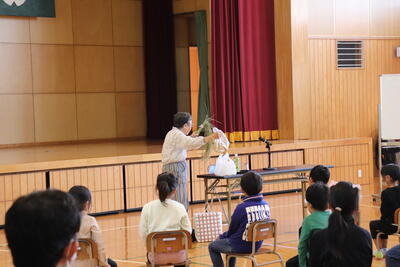 10月4日(水)朝から、クローバーの会の皆さんによる読み聞かせがありました。今日は、日髙さん、伊藤さん、立山さん、松永さん、打越さん、前田さんがいらっしゃいました。