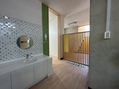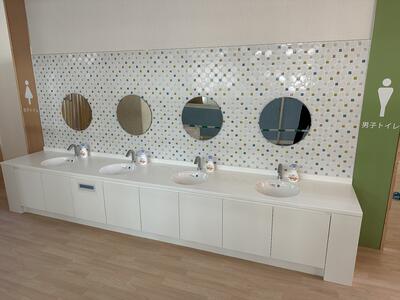 新しいトイレは、手洗いの水道や照明、換気扇などが自動で使えて衛生的です。また、男女が逆になり、女子用トイレが広くなりました。