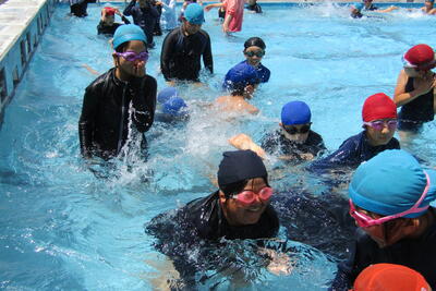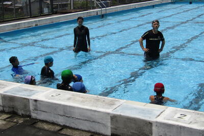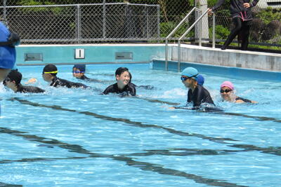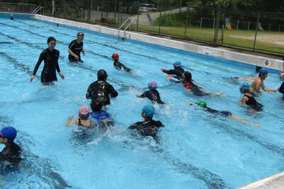 個々の泳力に合わせて担任の先生とサポートの先生でグループを分けて授業をしました。30人ぐらいの子どもたちに4~5人の指導者が関われる恵まれた環境で、子どもたちは泳力を伸ばしていきます。