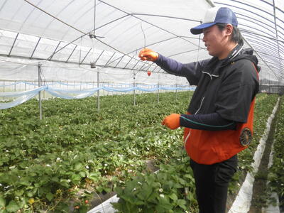いちご栽培の仕事についてお話を聞き、内容にびっくりしたあとは、収穫体験です。甘い香りのハウスの中で、ちぎったいちごを口にしたり、袋に入れたりして、たくさん収穫できました。