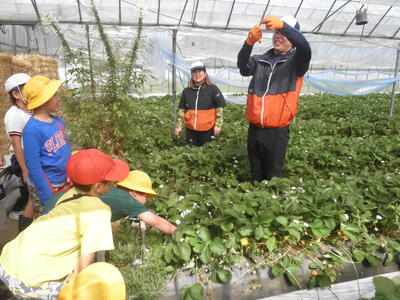 少し前のことですが、5月29日(水)、1年生保護者の德満さんのご協力で、1年生活科、3年社会科のいちご収穫体験ができました。
