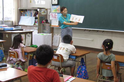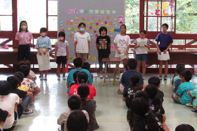 7月17日(水)、朝からクローバーさんによる読み聞かせでした。今日は、前田さん、松村さん、德満さん、打越さん、伊藤さん、永松さんの6人でした。