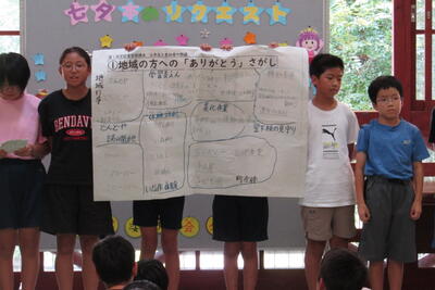 6年生からは「ありがとうプロジェクト」で考えた地域の方にしていただいていることを伝え、感謝(ありがとう)の伝え方を計画したら協力してほしいと話し、「おぼろ月夜」の2部合唱を披露しました。