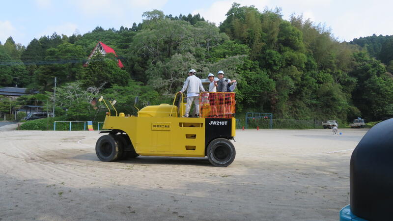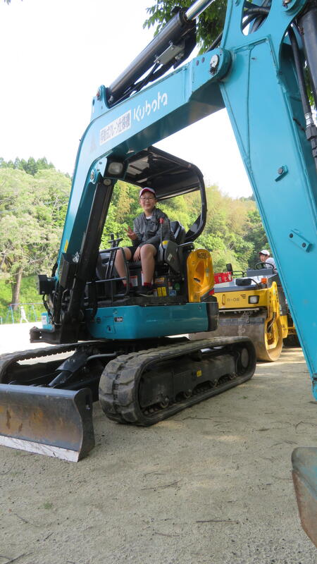 5月12日(月)の朝の8時から、11名の原賀工務店の方が来校されて、重機体験とグランド整備(グランド周辺の草刈り)をしてくださいました。