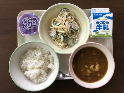 1月27日のメニューは、カレーライス、スパゲティサラダ、ぶどうゼリー、牛乳でした。