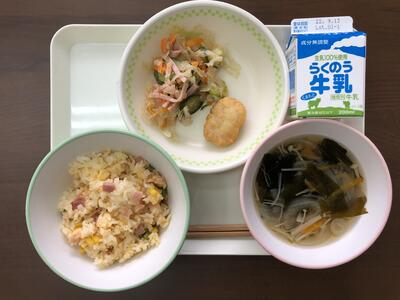 今日のメニューは、チャーハン、チキンナゲット、寒天サラダ、わかめスープ、牛乳でした。