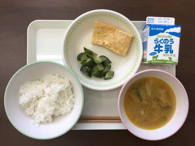 今日のメニューは、ごはん、魚の南部焼き、きゅうりの梅肉和え、厚揚げのみそ汁、牛乳でした。