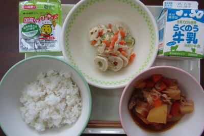 今日のメニューは、麦ご飯、トマト肉じゃが、ごまネーズサラダ、納豆、牛乳でした。