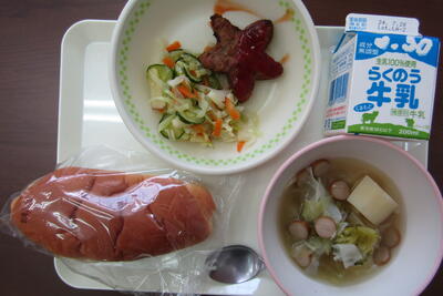 今日のメニューは、ミルクパン、ポトフ、星型ハンバーグ、フレンチサラダ、牛乳でした。
