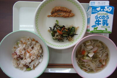 今日のメニューは、たこ飯、あおさ汁、きびなごカリカリフライ、ひじき和え、牛乳でした。
